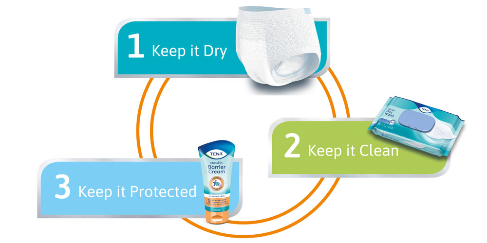 Marka TENA oferuje produkty wraz z pielęgnacją przeznaczoną specjalnie dla osób starszych z nietrzymaniem moczu. 3 proste kroki zostały opracowane, aby pomóc w zapewnieniu optymalnej codziennej opieki nad bliską osobą.